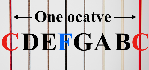 The red strings are C and the blue strings are F. This just repeats over and over!