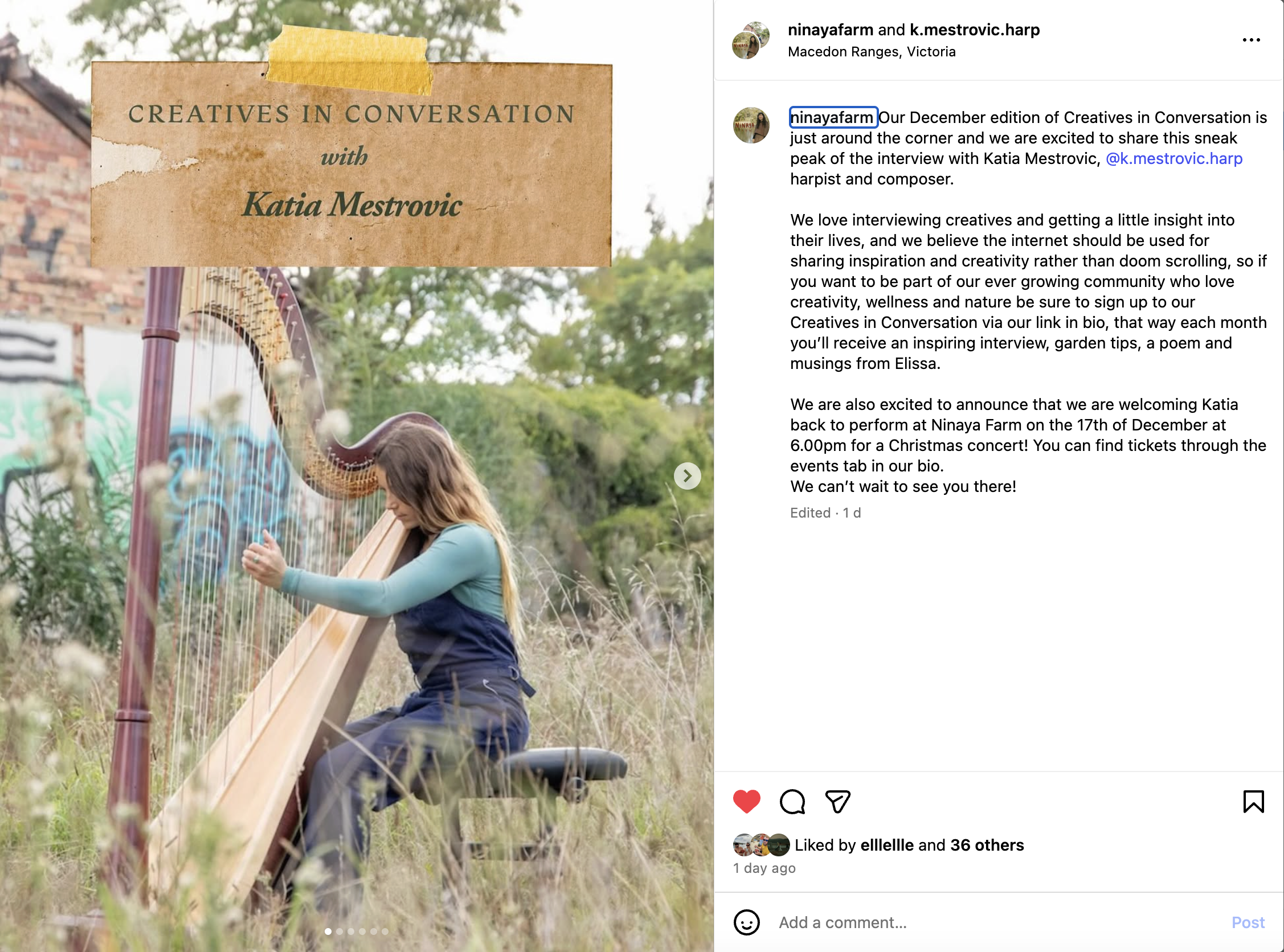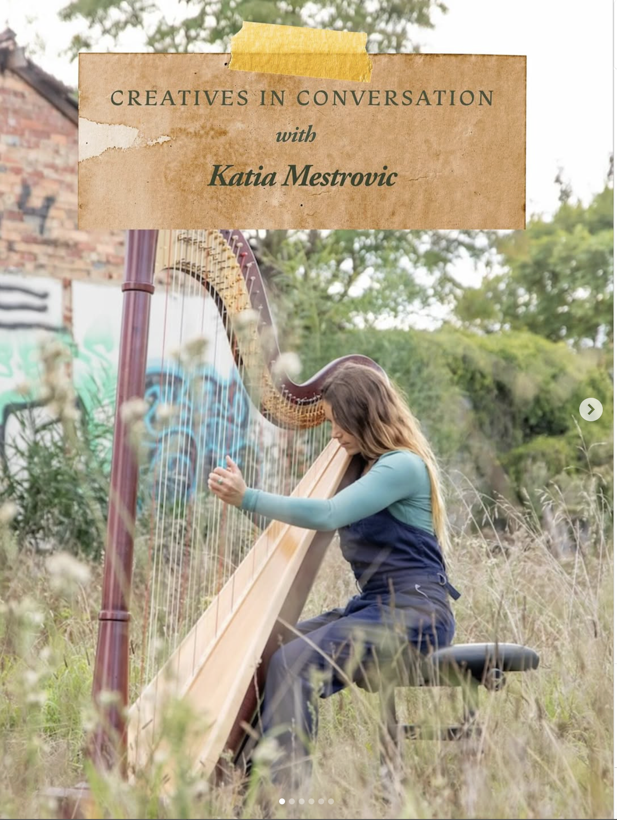 Katia is currently writing a commission for a 20 minute harp duet with amplification, electronics (synthesisers, sampling, hardware effects, & Ableton), and video. The premiere is forecast for late 2026. Previously, she’s completed commissions for Penta Harp Ensemble (“Electra;” a 7.5 minute harp quintet), The Hush Foundation (“Luminescence” a 4 minute harp and marimba duet, 2024), and the AMEB Harp Syllabus (two études for Grade 7, List A, 2021).